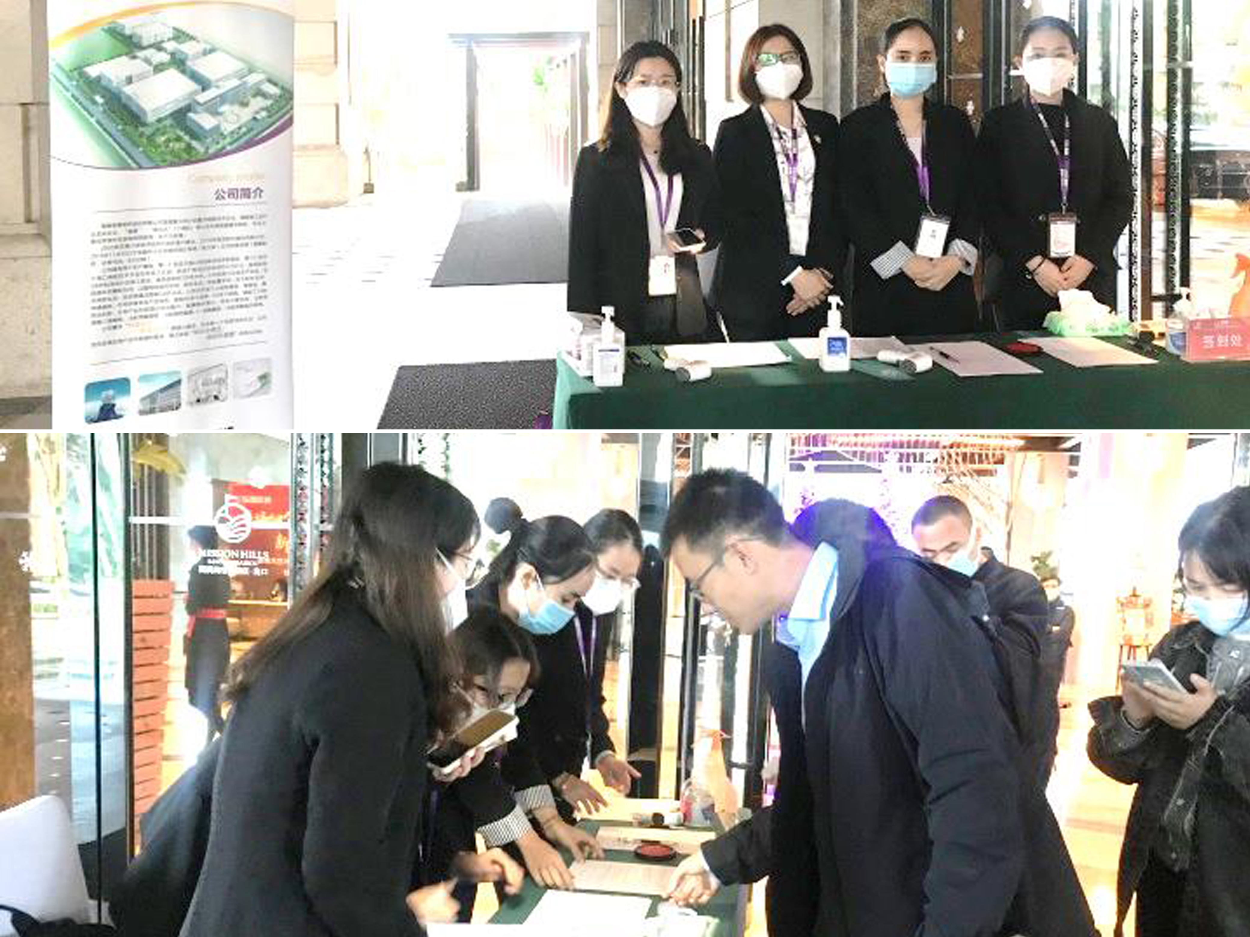 乘坐公司大巴車及自駕前往的企業高管們經過嚴格的防疫審查和登記,簽到后乘坐大巴車前往皇隆制藥。